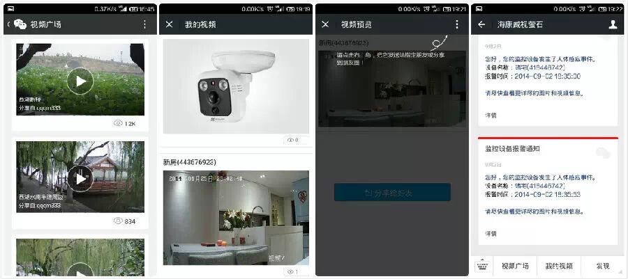 萤石与微信的结合,主要体现在:用户通过微信硬件服务号,可以和自己的萤石互联网摄像机进行交互,可以查看摄像机的直播视频并接收消息提醒,;在微信平台上实现萤石云视频在好友、讨论群、朋友圈中的直播视频和视频录像的分享。