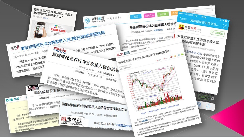 近日,香港联交所主板上市的腾讯(700)的微信平台与深交所上市的海康威视(002415)旗下品牌萤石正式达成合作——萤石作为互联网智能视频服务商,首家实现了智能视频摄像机与微信的互联互通。