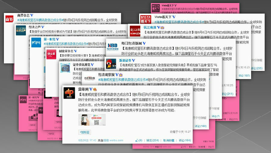 视频行业领导品牌海康威视旗下新秀——萤石,近期动作频频。继与乐视网强强联手,宣布跨界合作后,于8月26日互联网大会宣布与微信合作,成为了首家实现智能视频摄像机与微信互联互通的视频服务商。与微信高调“晒恩爱”,引起了互联网地震,遭百余家互联网门户媒体网站疯转。