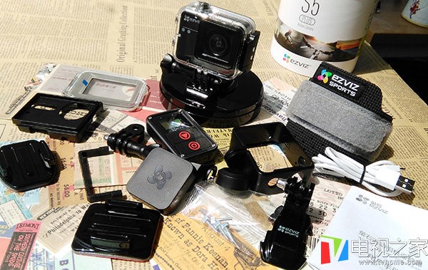 盒内的赠送的附件有腕带式遥控器(配腕带)、电池、数据线、粘胶底座(平)、粘胶底座(凹)、J型接头、可转换骨节(长、短)×2、螺杆×3、无人机转接 支架、40米防水壳、防水壳可触摸背板、防水壳镜头保护盖以及使用说明书。使用萤石S5 Plus需要搭配一张高速micro SD卡(卡速在C10以上),为了方便用户一拿到设备即可使用,设备在出厂时还附带了一张8G的高速体验卡,供使用者体验使用。