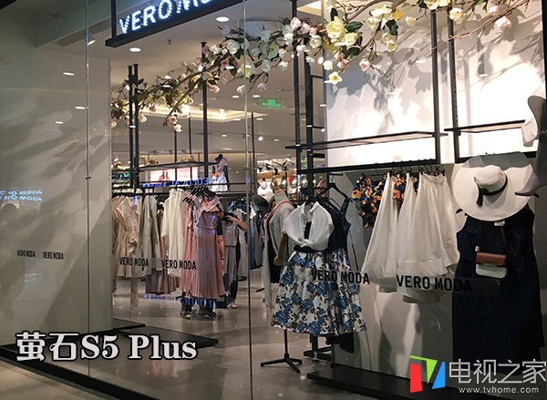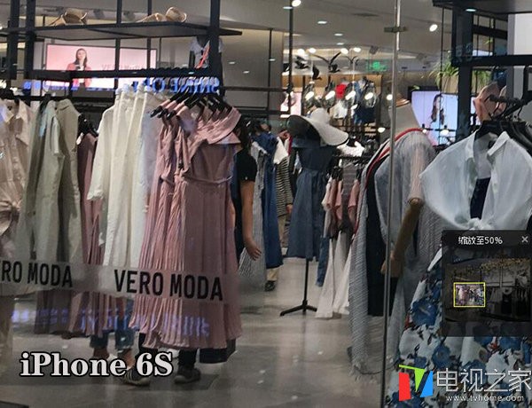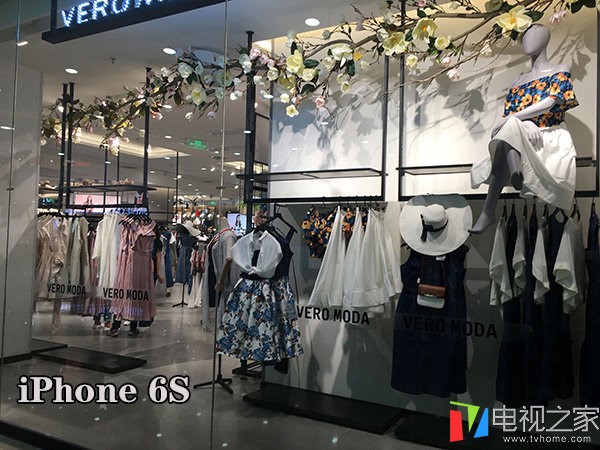 本次评测中所有的照片都以12MP相素拍摄,这个橱窗的照片里,上方的萤石S5 Plus的拍摄效果色彩偏暖。由于萤石S5 Plus采用广角拍摄,所以拍摄范围比iPhone 6S宽泛很多。