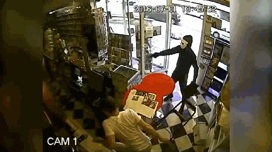 这是一段由监控摄像头录下的视频。晚上6点左右,一位外国网友出门倒垃圾,刚倒完准备回屋就发现一个带着面具持枪的匪徒,这位歹徒步步紧逼,网友吓得赶紧躲了起来。(换成是小编的话,也会害怕!)这时候一条德牧从天而降,一个箭步上去就咬住歹徒的手。最终这位网友和德牧联手将这位歹徒赶出门外并制服。