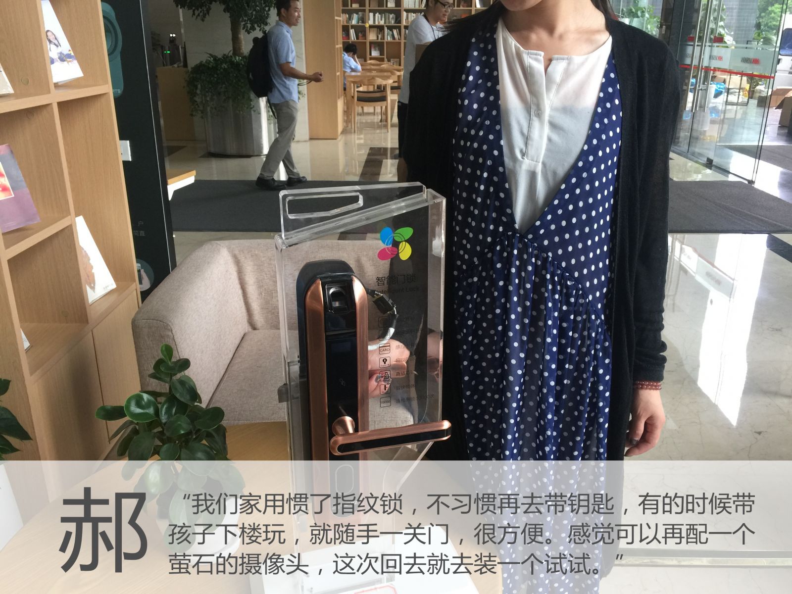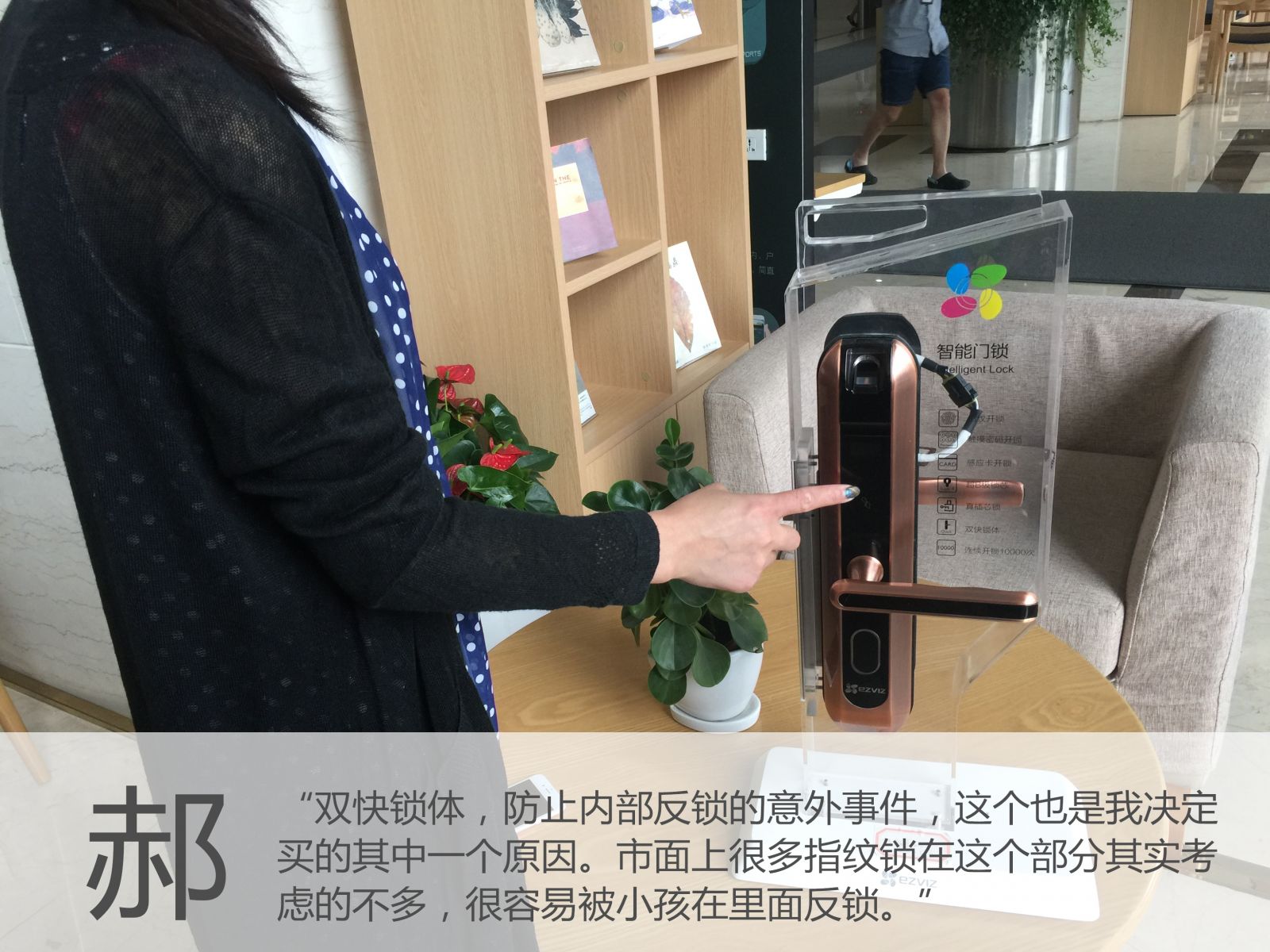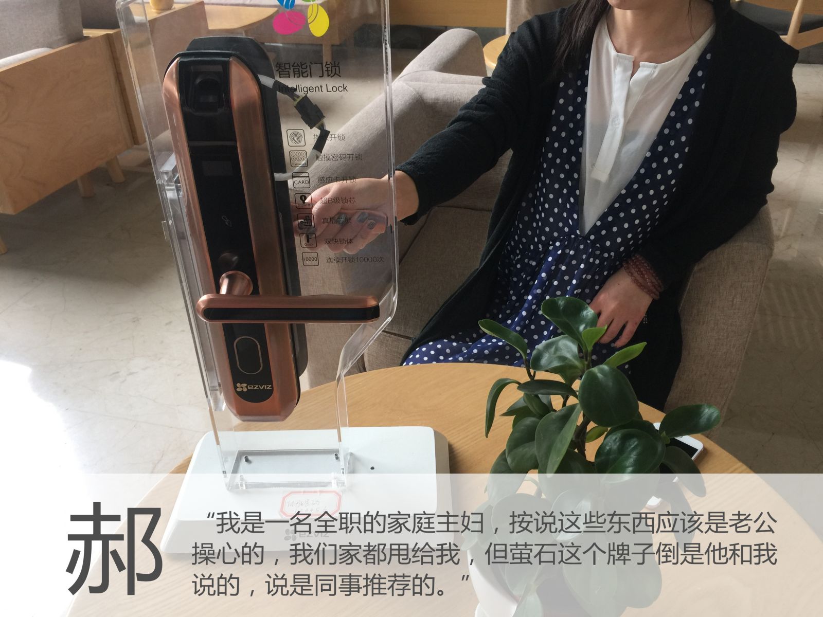 郝女士家里之前未曾接触过萤石产品,此次购买萤石指纹锁,是因为家里的指纹锁需要换了,一开始也是在众多品牌中挑选,老公的同事是萤石的用户,经介绍,最终选择了萤石。