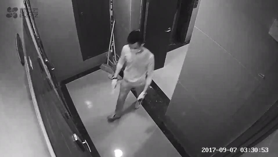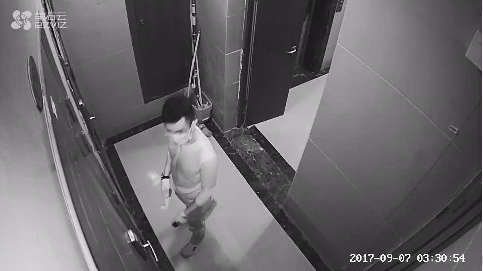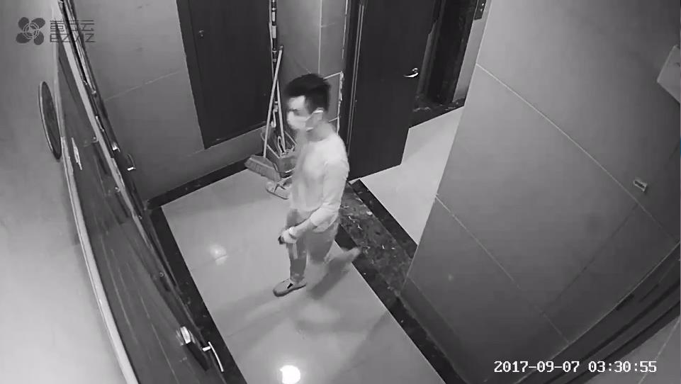 大概3点30分左右,突然从电梯旁钻出一位蒙面大汉,毫无顾忌地带着一件武器就准备直奔向一家住户的门锁那里,小心翼翼这个词就从未出现在他的人生字典里。