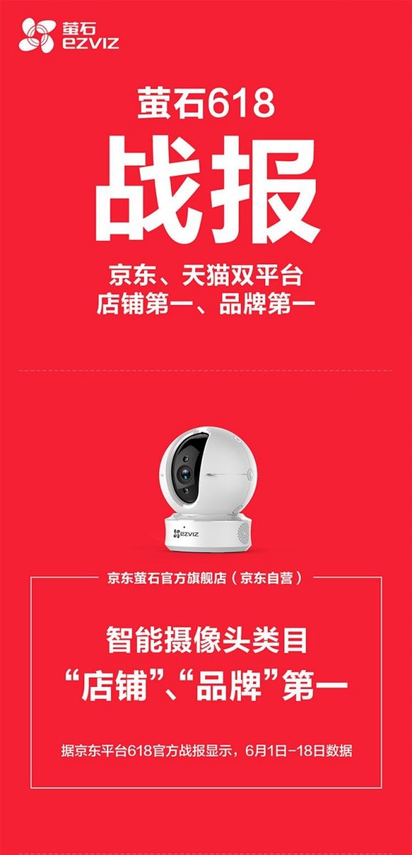 据京东平台618官方战报显示,6月1日-18日,京东萤石官方旗舰店(京东自营)摘得智能摄像头类目“店铺”、“品牌”第一。