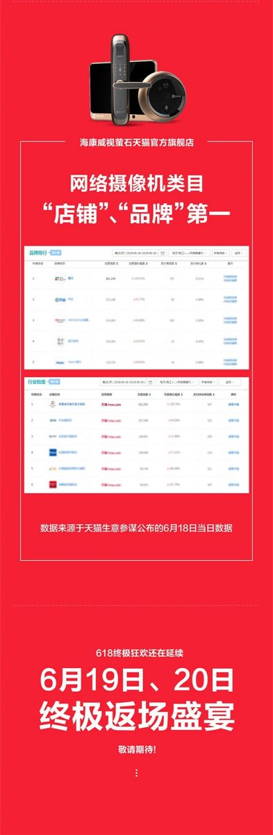天猫生意参谋公布的最新数据显示,618当天,海康威视萤石天猫官方旗舰店拿下网络摄像机类目“店铺”、“品牌”第一。