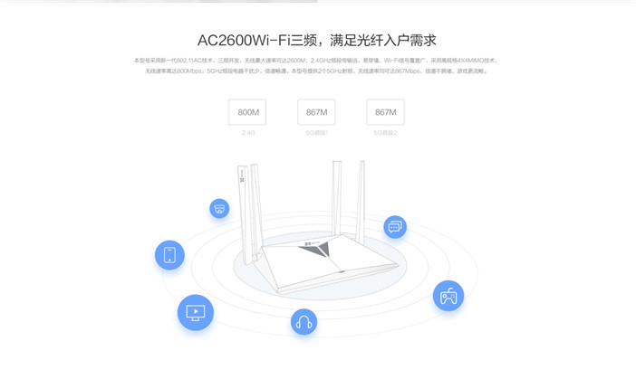在性能上,萤石W3采用新一代802.11AC技术,三频开发,无线最大速率可达2600M,满足光纤入户需求,高端大气上档次。