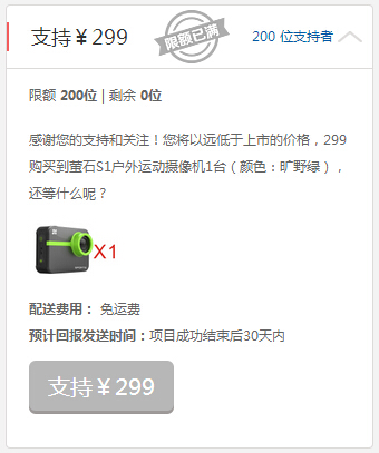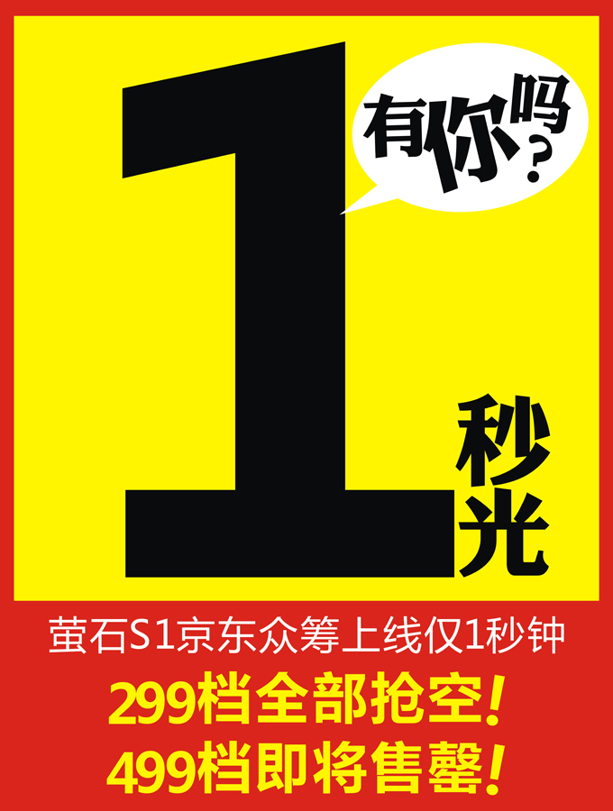 萤石S1京东众筹1秒成功!上线60分钟,累计3616人支持!4641人点赞!已募集到资金近50万元,项目进度已超952%!299档1秒抢空,499档即将售罄!你,还不出手?