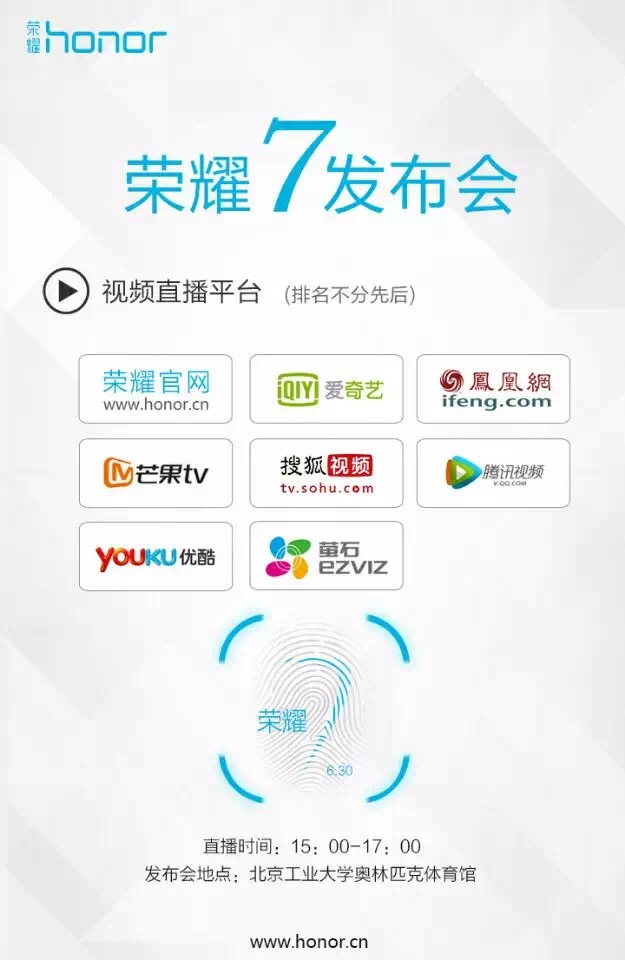 6月30日下午三点,华为荣耀7发布会在北京工业大学举行,继去年成功推出超快网速的荣耀6和平行双镜头荣耀6 Plus之后,华为荣耀再次发力,在会上推出新一代旗舰机,即备受关注的荣耀7。发布会由萤石云视频、荣耀官网、搜狐视频、优酷等进行现场直播,全程见证华为荣耀7的诞生。