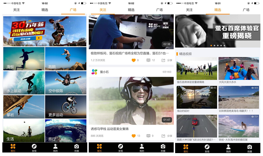 萤石运动2.0由精选、关注、广场、达人、个人、消息系统、相册、拍摄几大模块组成。这些模块贯穿了用户的主要使用场景:操控S1、创作视频、发布与分享、展示个性自我、观看精彩视频、与动友互动。