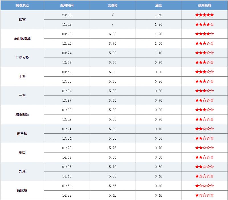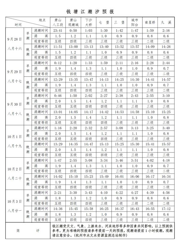 国庆节钱塘江潮汐预报