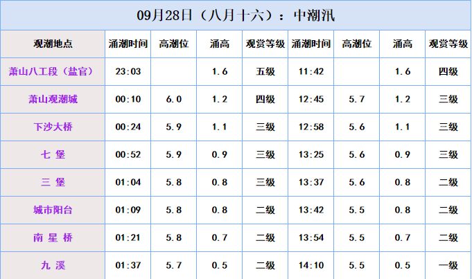 马上就要到农历的八月十八,又到了一年的观潮时,根据杭州水文总站最新预报,从9月28日(八月十六)到10月3日(八月廿一),萧山八工段早晚潮观赏级别均达到五级,而萧山观潮城、下沙大桥、七堡、三堡、城市阳台都在三级以上。