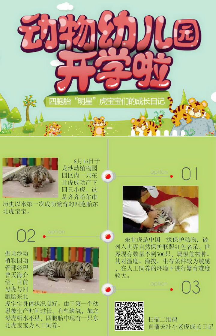萤石新闻中心2015年10月1日讯 龙沙动植物园的抚养员介绍,小虎出生时体重约1.3公斤,大约一周可以睁眼,十天左右可正常行走,45日龄开始采食肉沫。主要食物有鲜牛肉、活鸡、鸡肉、鸡蛋等和多种维生素。