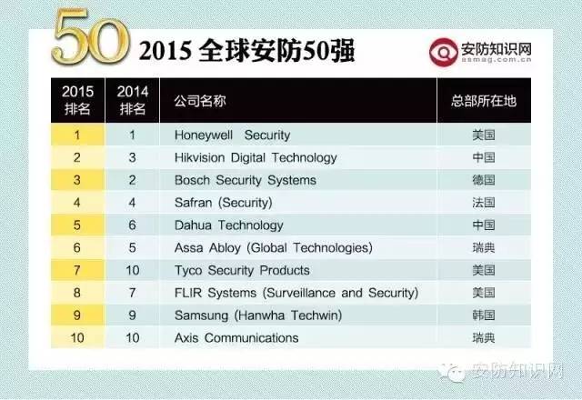 11月14日,全球知名的工业媒体a&s《安全自动化》(MFNE法兰克福新时代传媒)发布2015年度全球安防50强榜单。海康威视凭借卓越的成绩,跃居“全球安防50强”第二名,蝉联亚洲第一名。