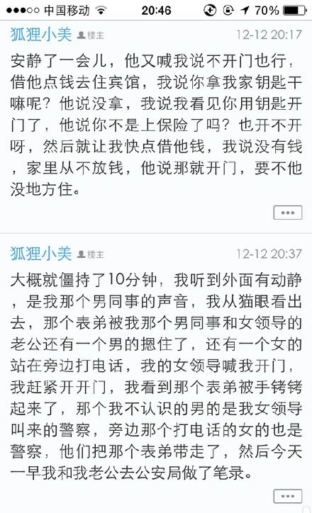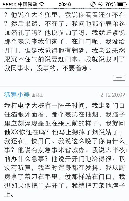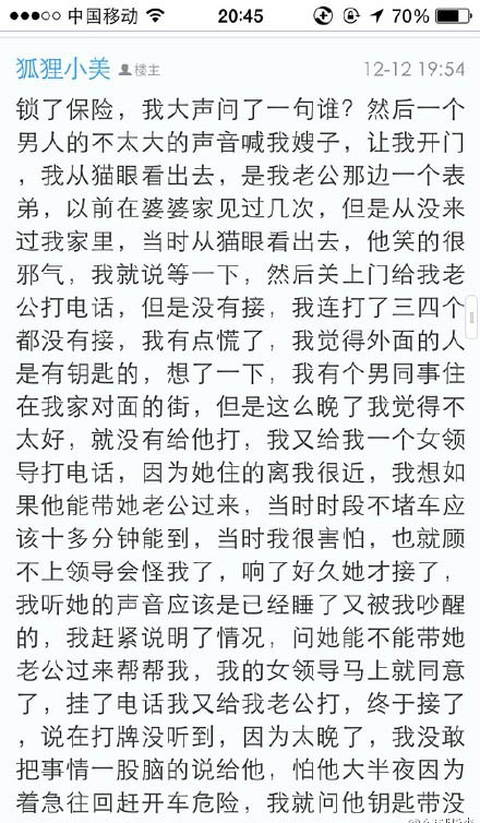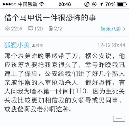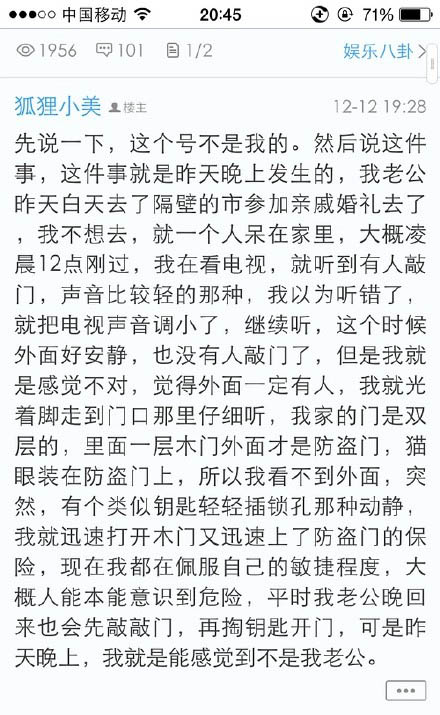 帖子发出后,也有网友问楼主为什么不第一时间报警,但试想一下,假如作案者有同伙假扮警察前来接警,楼主开门之后,后果不堪设想。所以在这种情况下,请熟人带警察前来是比较明智的做法。