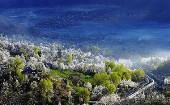 梨花处处有,惟独赞金川。同是梨花,四川阿坝州金川县的梨花却与别处不同,最老的一株梨树便生长了一百多年,一簇簇花朵开得无比繁盛,花瓣如丝绒般柔软。寨子道路两旁,盛开的梨花自然搭成一个天然的屏障,将行人以及过往的车辆掩映在铺满梨花奇景的世外桃源中。