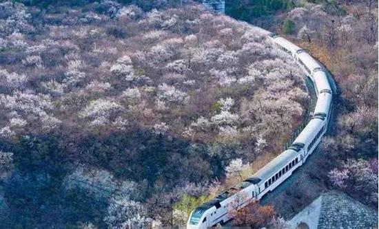 该和谐号列车是北京市郊铁路S2线,从北京北到八达岭票价约6元。途径的居庸关长城是京北长城沿线上的著名古关城,当列车穿越花海,时间也仿佛在这一刻静止了。有人说这组照片应该称为“樱木花道”,绝对秒杀日本樱花。