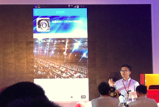 京东战略总监那昕现场演示了萤石摄像机在六合鸡舍的实时直播视频。“这是我们与国内最大的安防企业海康威视联合打造的智能视频系统,这是即时的画面,大家可以看到非常的清晰,我们通过手机即可实时看到鸡舍里的情况,确保食品来源。这还可以应用于更多的场合。”