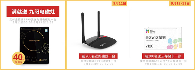 现货期间,每天上午9:00-12:00,购物满699就有机会获赠W1路由器1台或7天云存储年卡1张,消费满1999还能抢赠九阳电磁灶1台,机会在眼前,就看你够不够快了~